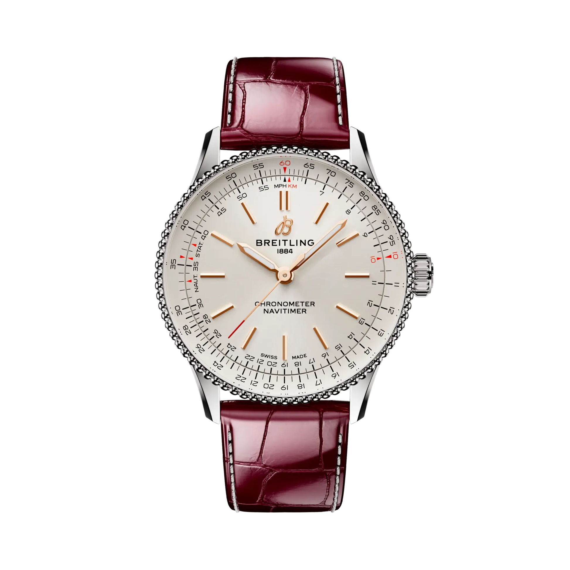 PRE-OWNED BREITLING NAVITIMER WITH SILVER DIAL, STEEL CASE, AND BURGUNDY ALLIGATOR LEATHER STRAP