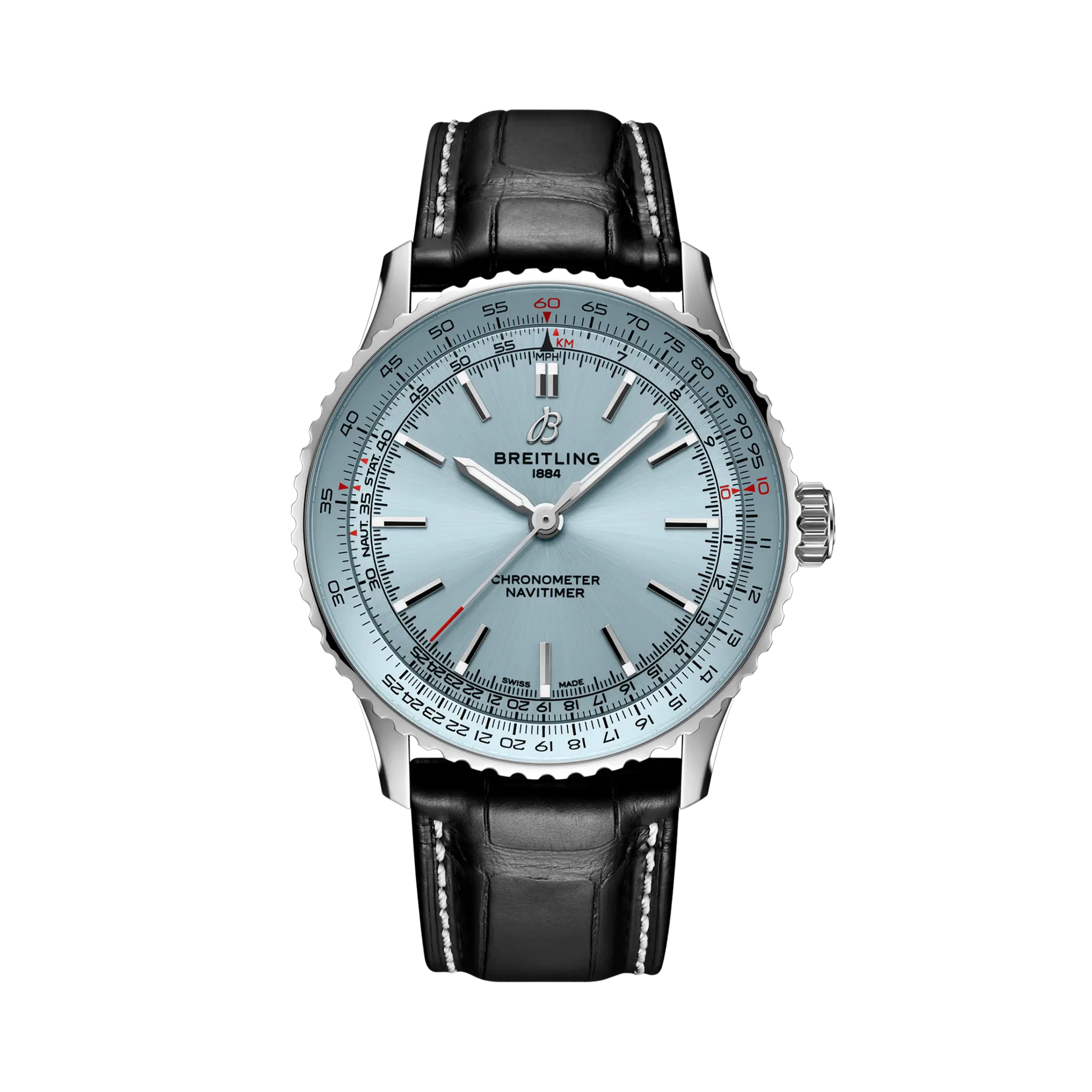 PRE-OWNED BREITLING NAVITIMER WITH ICE BLUE DIAL, STEEL CASE, AND BLACK LEATHER BRACELET