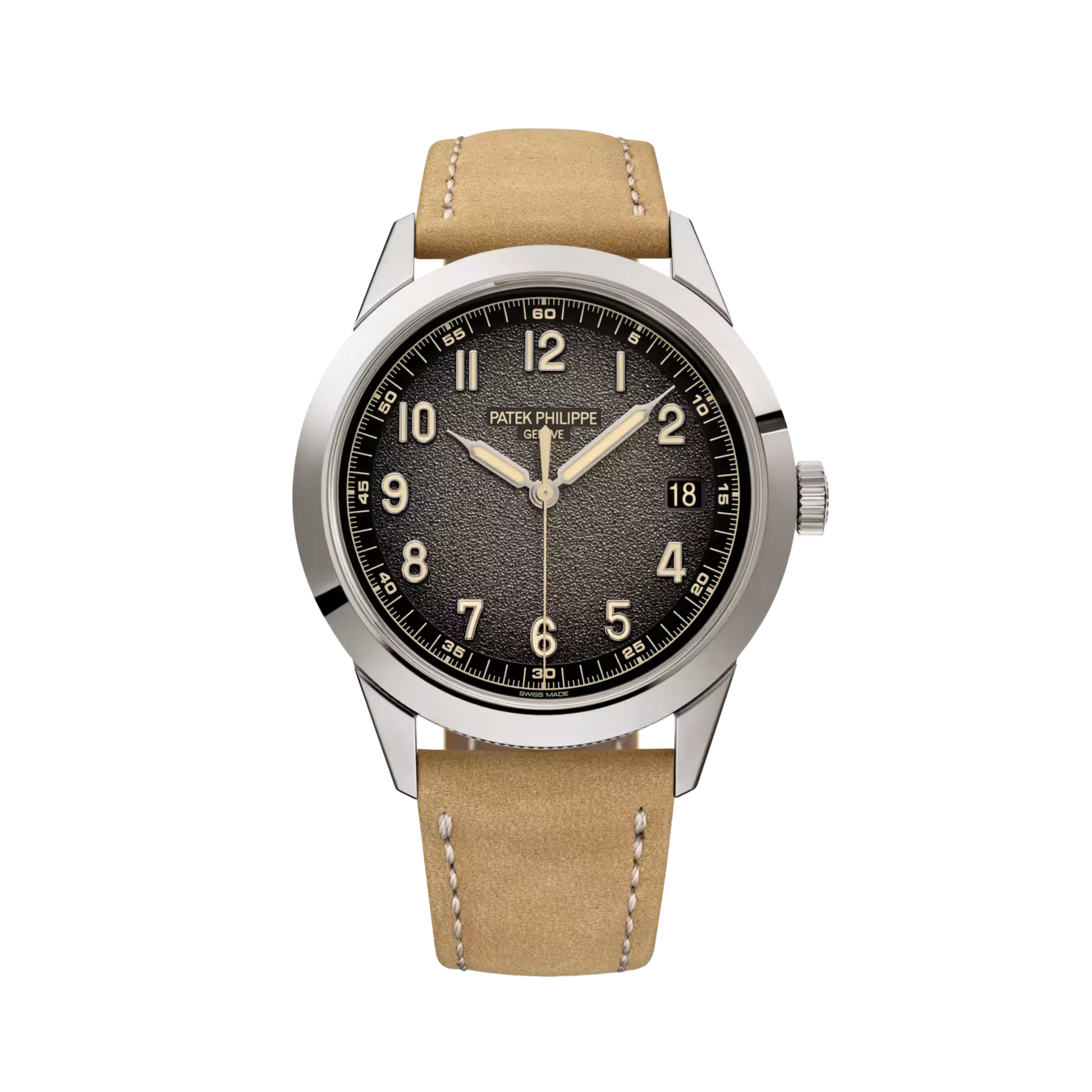 PRE-OWNED PATEK PHILIPPE CALATRAVA WITH DATE WINDOW AND SWEEPING SECOND HAND, GRAY GRADIENT DIAL, WHITE GOLD CASE, AND BEIGE CALFSKIN STRAP