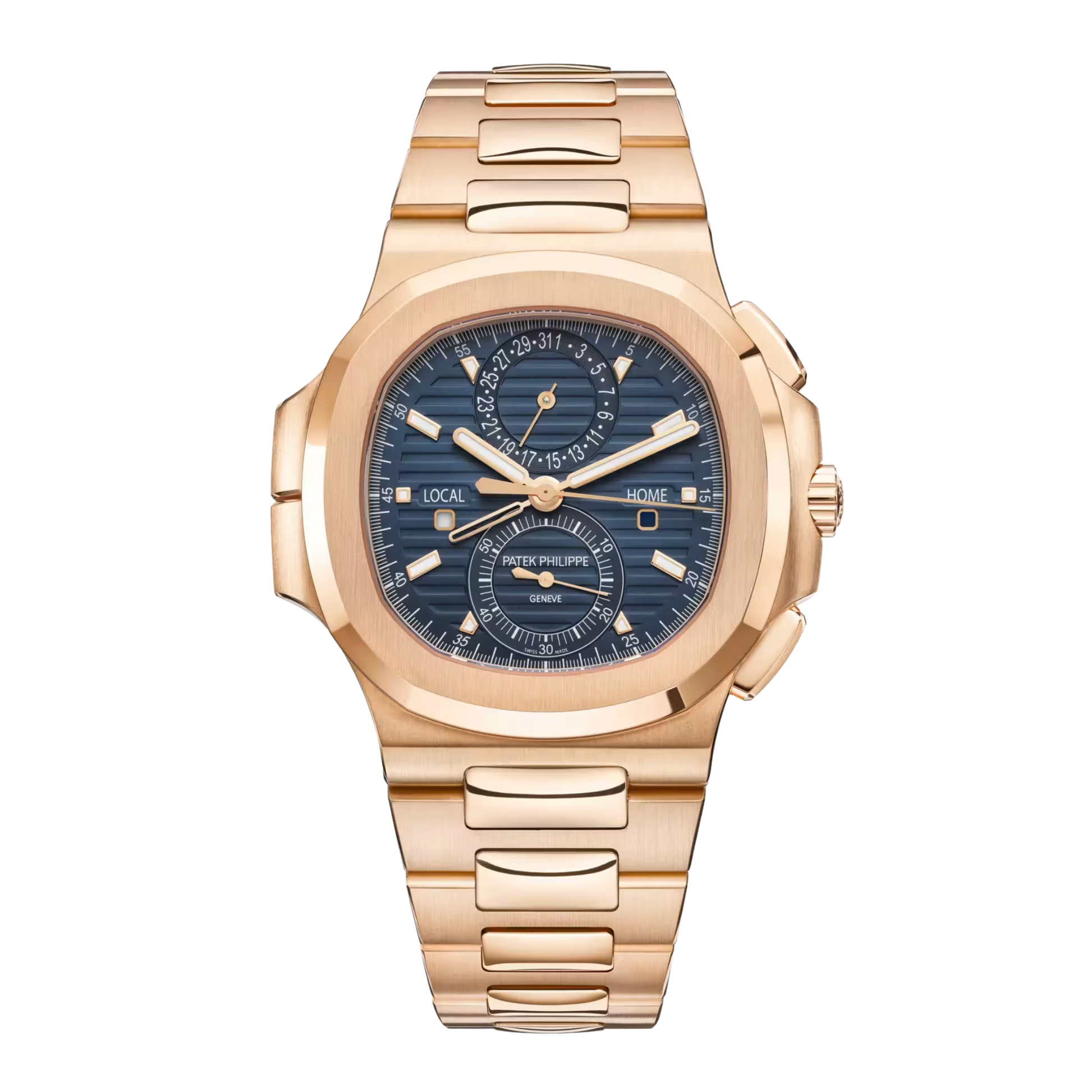 PRE-OWNED PATEK PHILIPPE NAUTILUS WITH FLYBACK CHRONOGRAPH AND DUAL TIMES ZONES, BLUE DIAL, ROSE GOLD CASE AND BRACELET