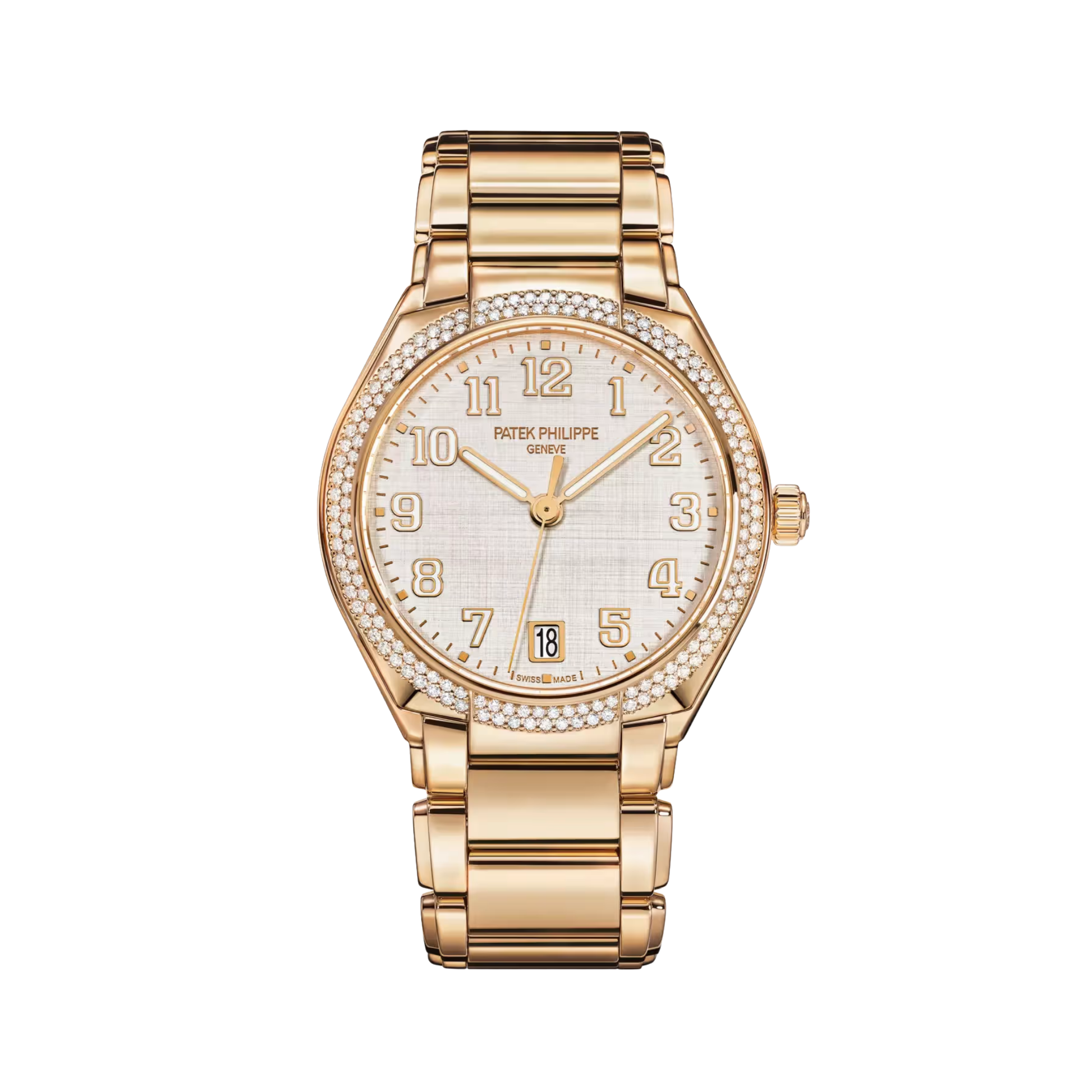 PRE-OWNED PATEK PHILIPPE TWENTY~4 WITH SILVER DIAL, ROSE GOLD CASE/BRACELET, AND DIAMOND SET BEZEL