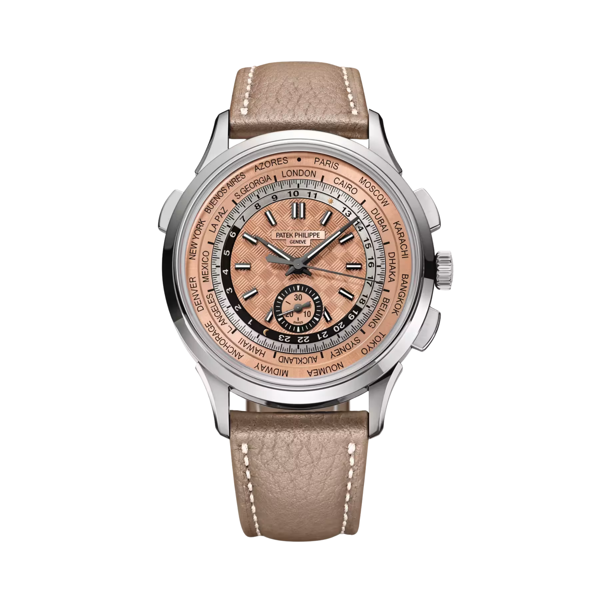 PRE-OWNED PATEK PHILIPPE COMPLICATIONS WITH WORLD TIME, FLYBACK CHRONOGRAPH, ROSE-GILT DIAL, STEEL CASE, AND TAUPE CALFSKIN STRAP
