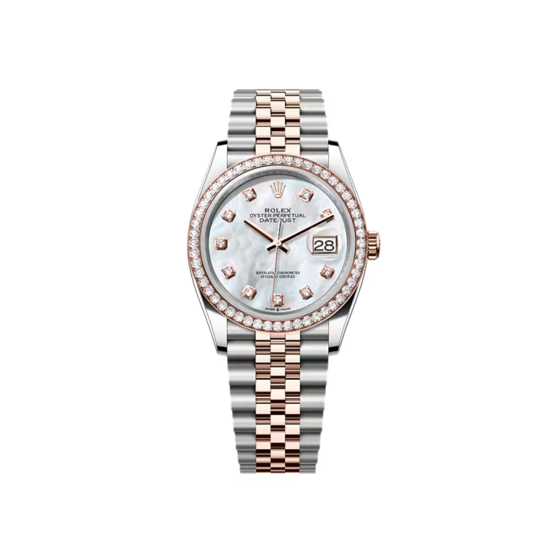 PRE-OWNED ROLEX DATEJUST 36MM, WITH WHITE MOTHER-OF-PEARL DIAMOND SET DIAL, DIAMOND SET BEZEL, AND EVEROSE ROLESOR CASE/BRACELET