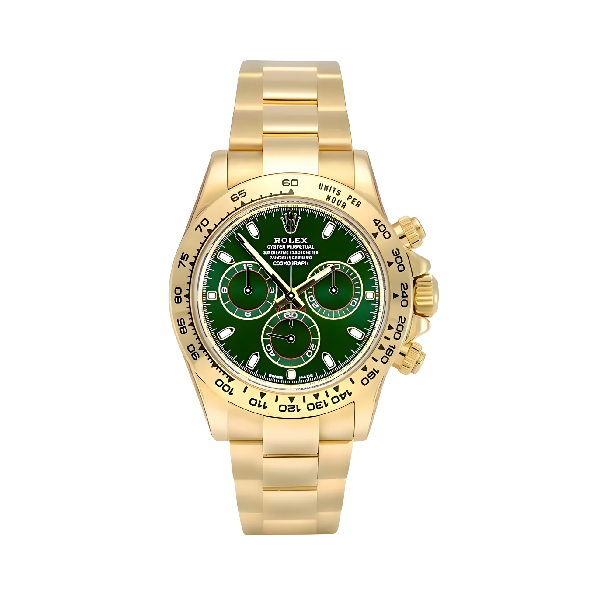 PRE-OWNED ROLEX COSMOGRAPH DAYTONA 40MM WITH GREEN DIAL AND GOLD CASE/BRACELET