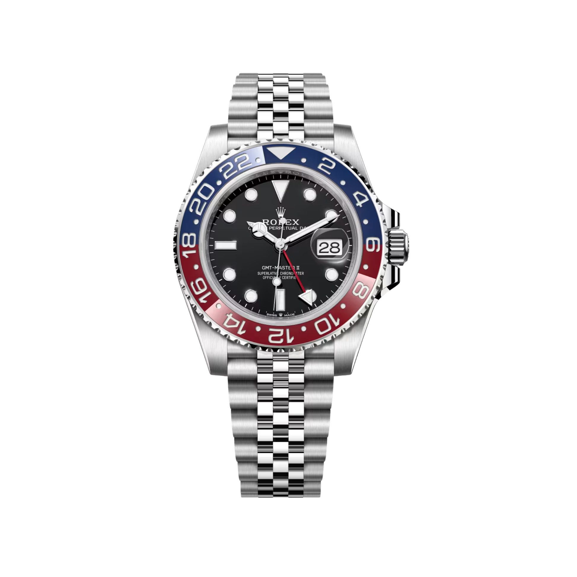 PRE-OWNED ROLEX GMT-MASTER II 40MM, WITH BLACK DIAL, BLUE AND RED CERACHROM BEZEL, AND OYSTERSTEEL CASE/BRACELET