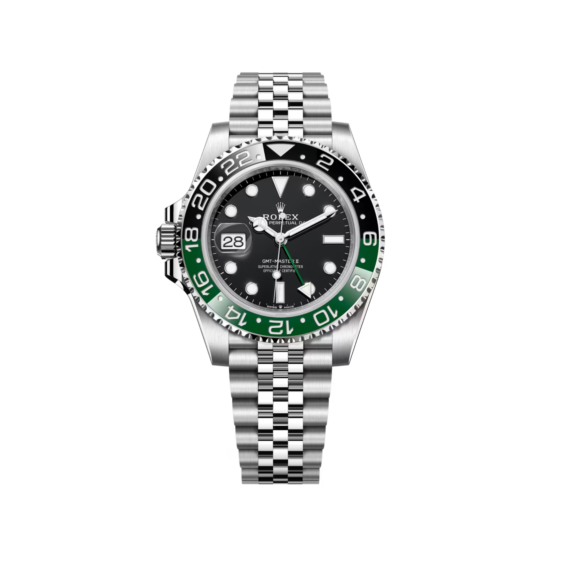 PRE-OWNED ROLEX GMT-MASTER II 40MM, BLACK DIAL, BLACK AND GREEN CERACHROM BEZEL, AND OYSTERSTEEL CASE/BRACELET